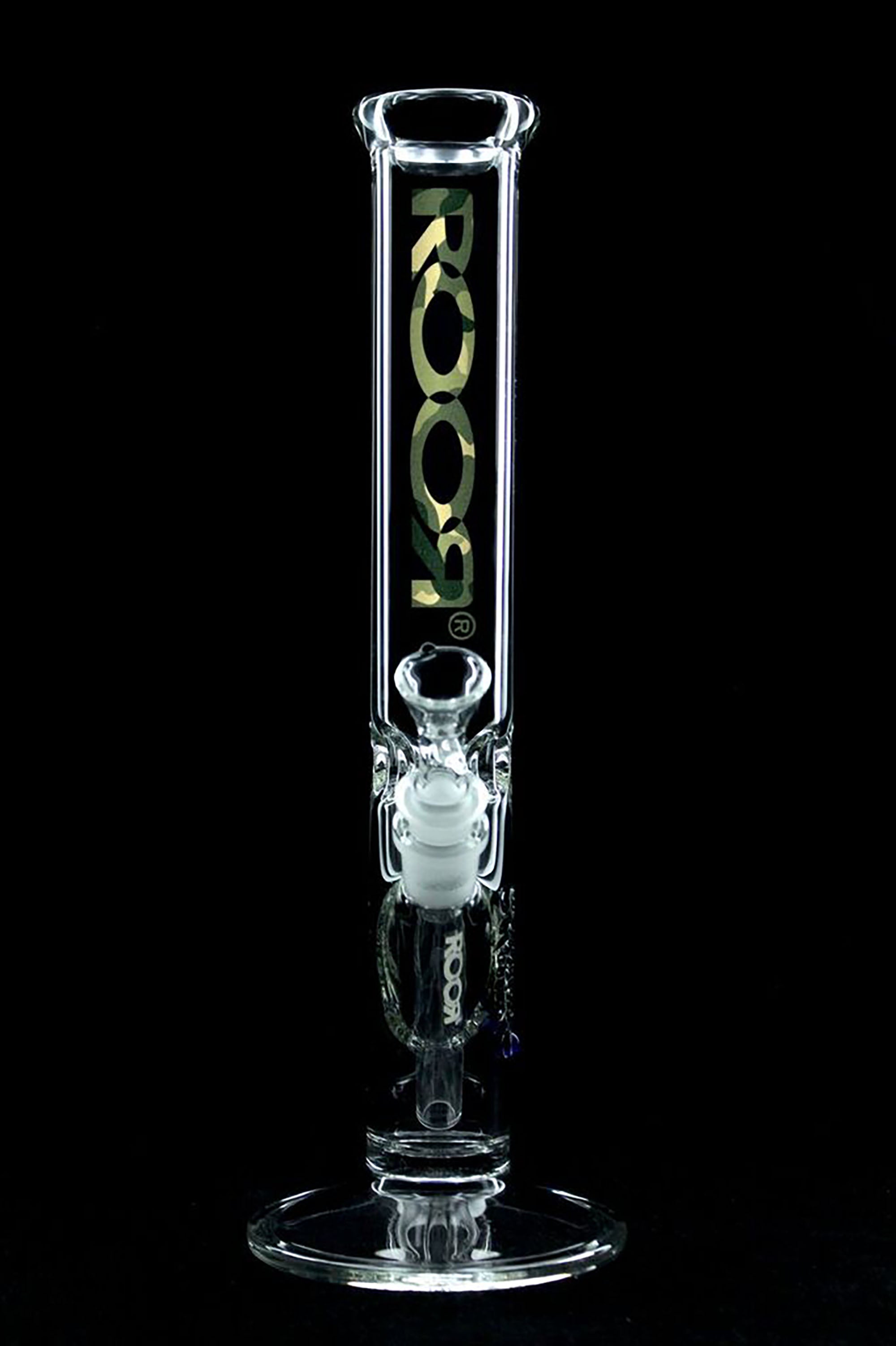 ROOR 14” Straight has been a standard for smokers and collectors since 1995. Born of 50mm x 5mm German Schott glass. Each ROOR Straight tube proudly displays a unique signature. The ROOR Straight has been scientifically proportioned to make each use an easier pull with more diffusion and provides more smoke per draw. Each classic ROOR Straight has built in ice pinches allowing the option of the addition of ice to cool any hit. To ensure a perfect hit each time this piece is used, every downstem is hand measured and cut to each individual piece. Includes: 14” Straight base 50mm X 5mm thick with Camo Decal Low profile 19mm/14mm open ended downstem 14mm medium size funnel bowl ROOR Box Authentication seal *Attached to Tube